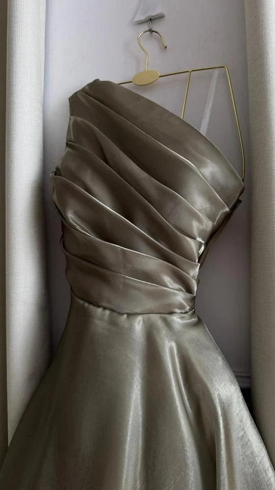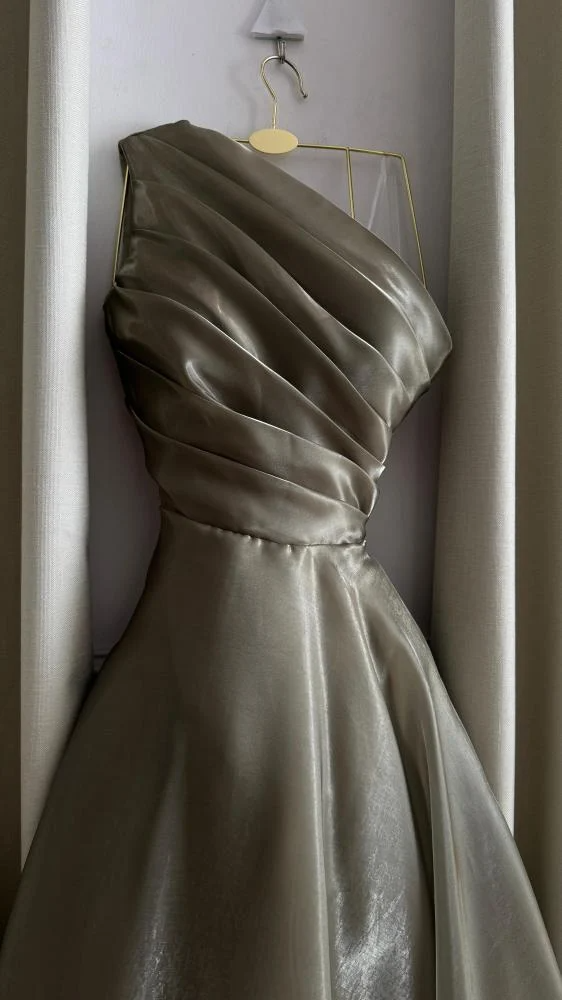 - قماش لامع يمنح الفستان حضورًا أنيقًا دون إفراط