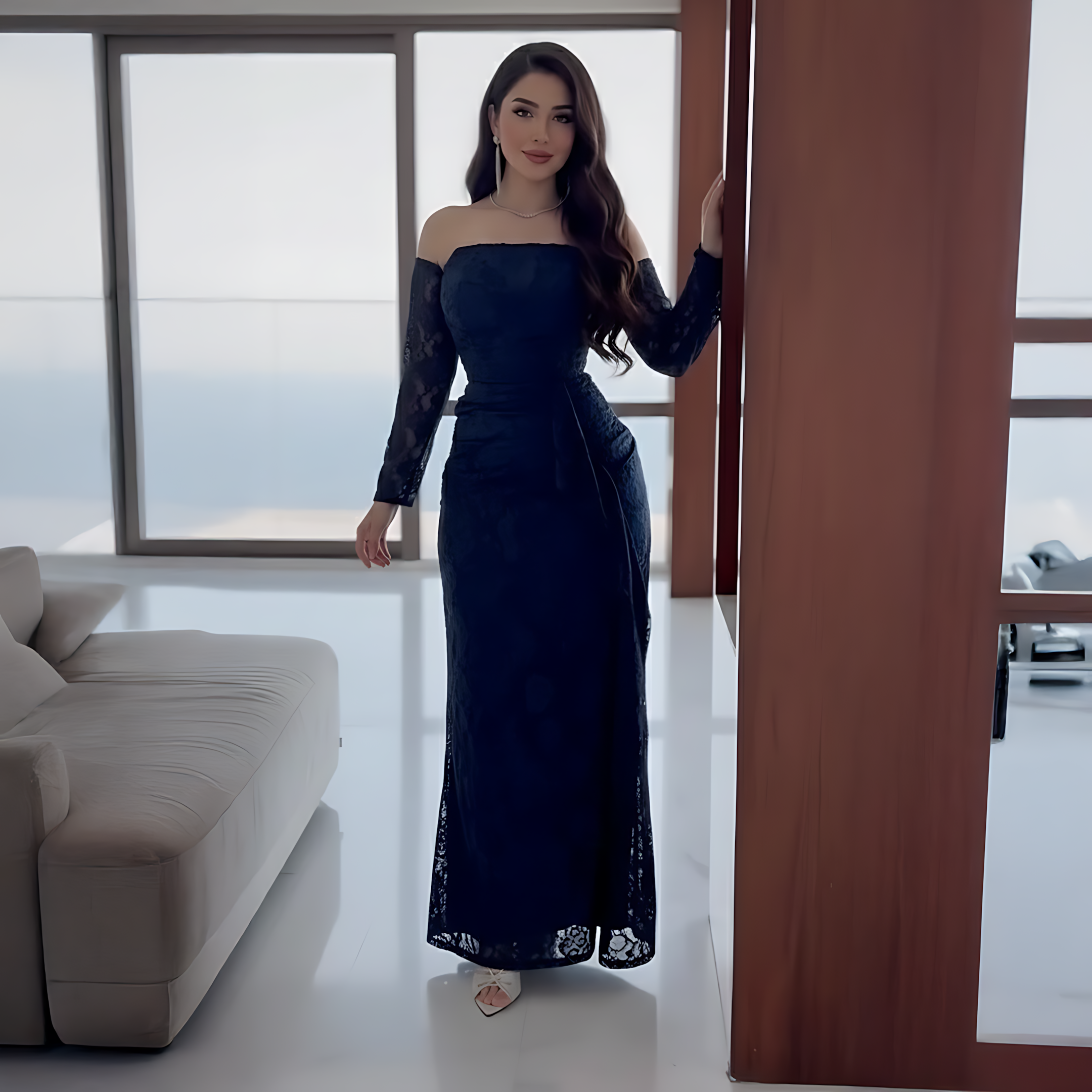 هذا الفستان خيار مثالي لمحبات الألوان الفخمة بتصميم ناعم. ولمن تبحث عن فستان نيلي بسيط يمنحها حضورًا أنيقًا ومميزًا، يجمع هذا التصميم بين الرقي والنعومة في إطلالة متكاملة